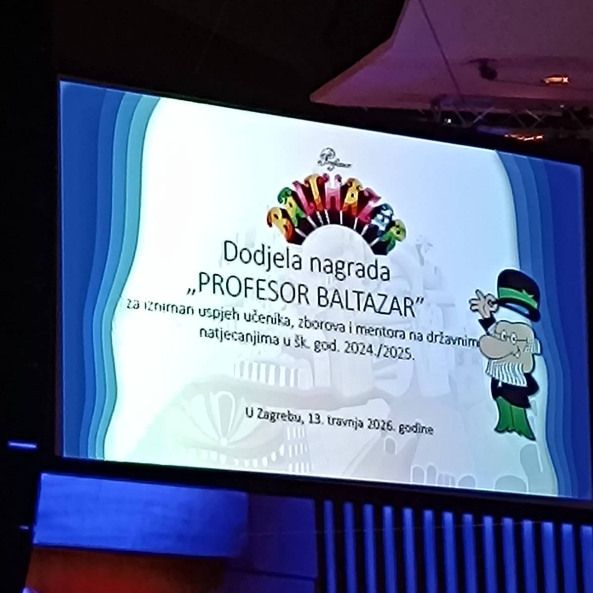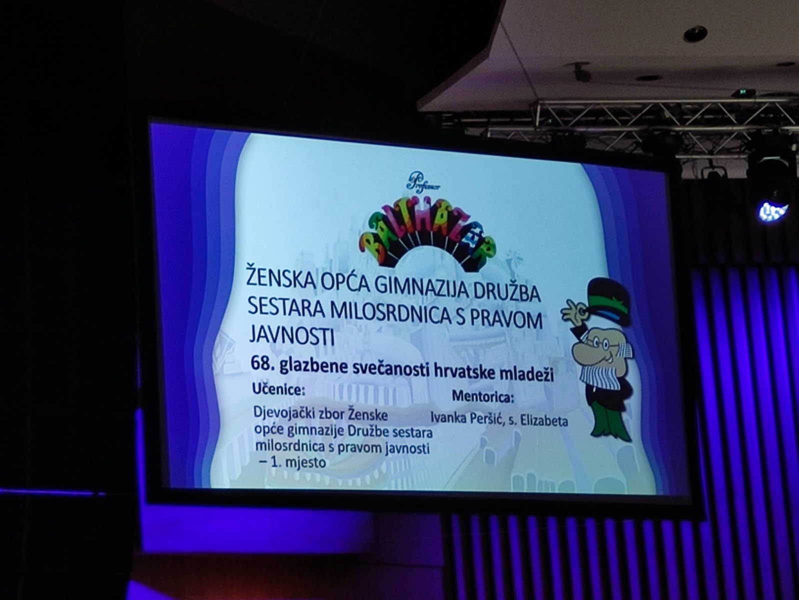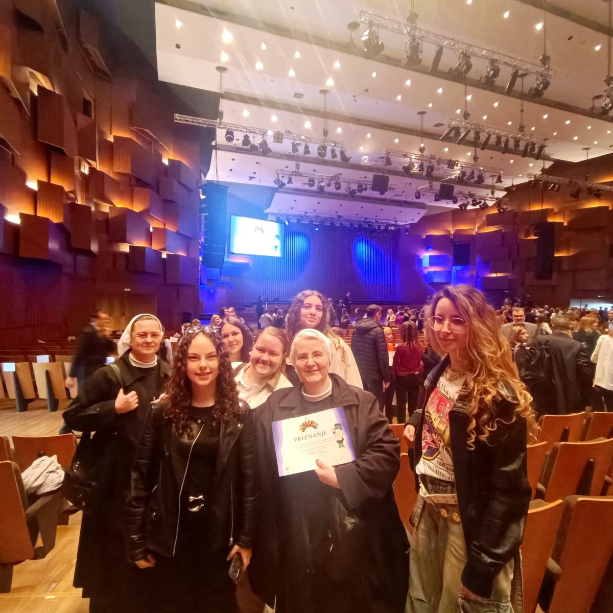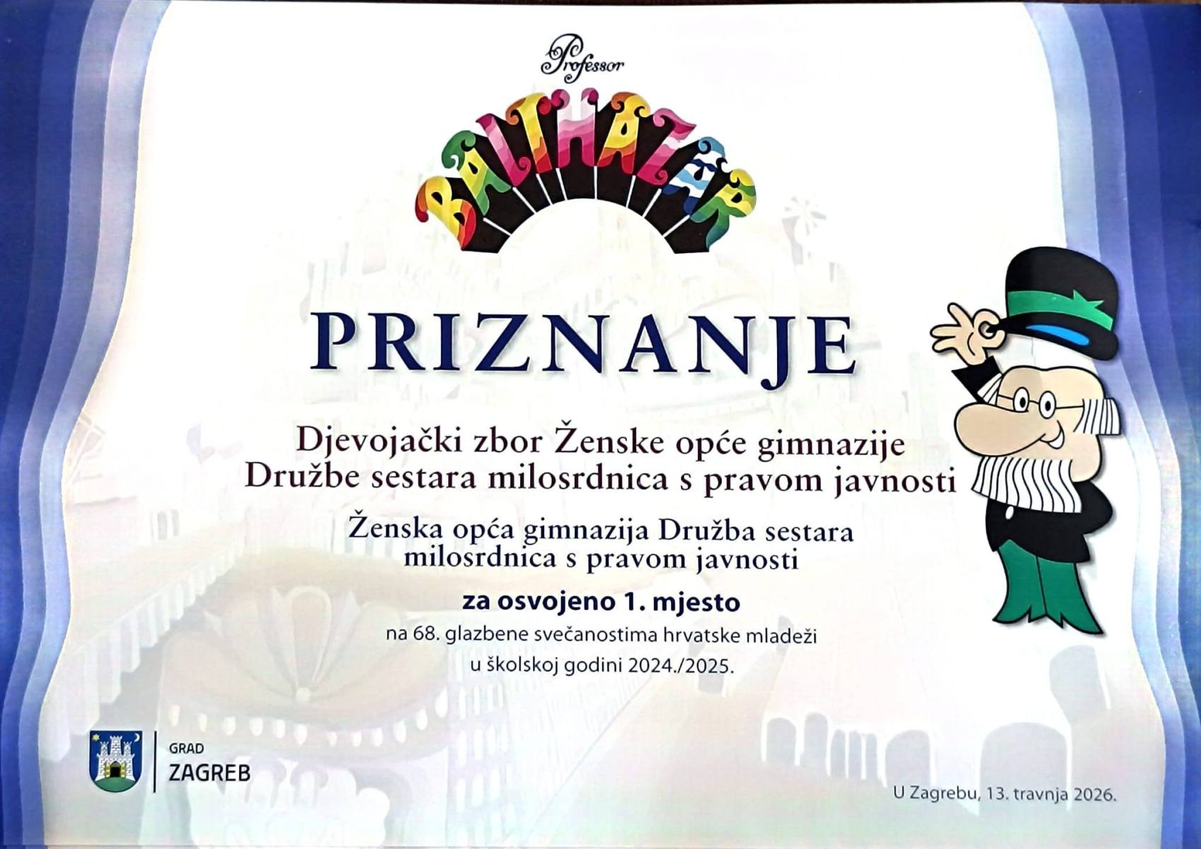 Grad Zagreb svake godine dodjeljuje nagradu “Profesor Balthazar” za izniman uspjeh učenicima, zborovima i mentorima, tj. svima koji su osvojili prva tri mjesta na državnim natjecanjima. Među nagrađenima bio je i zbor naše gimnazije i njihova mentorica s. Elizabeta Peršić za osvojeno 1. mjesto na državnoj smotri zborova u Varaždinu. Čestitamo im i želimo još puno uspješnih nastupa! ![]()